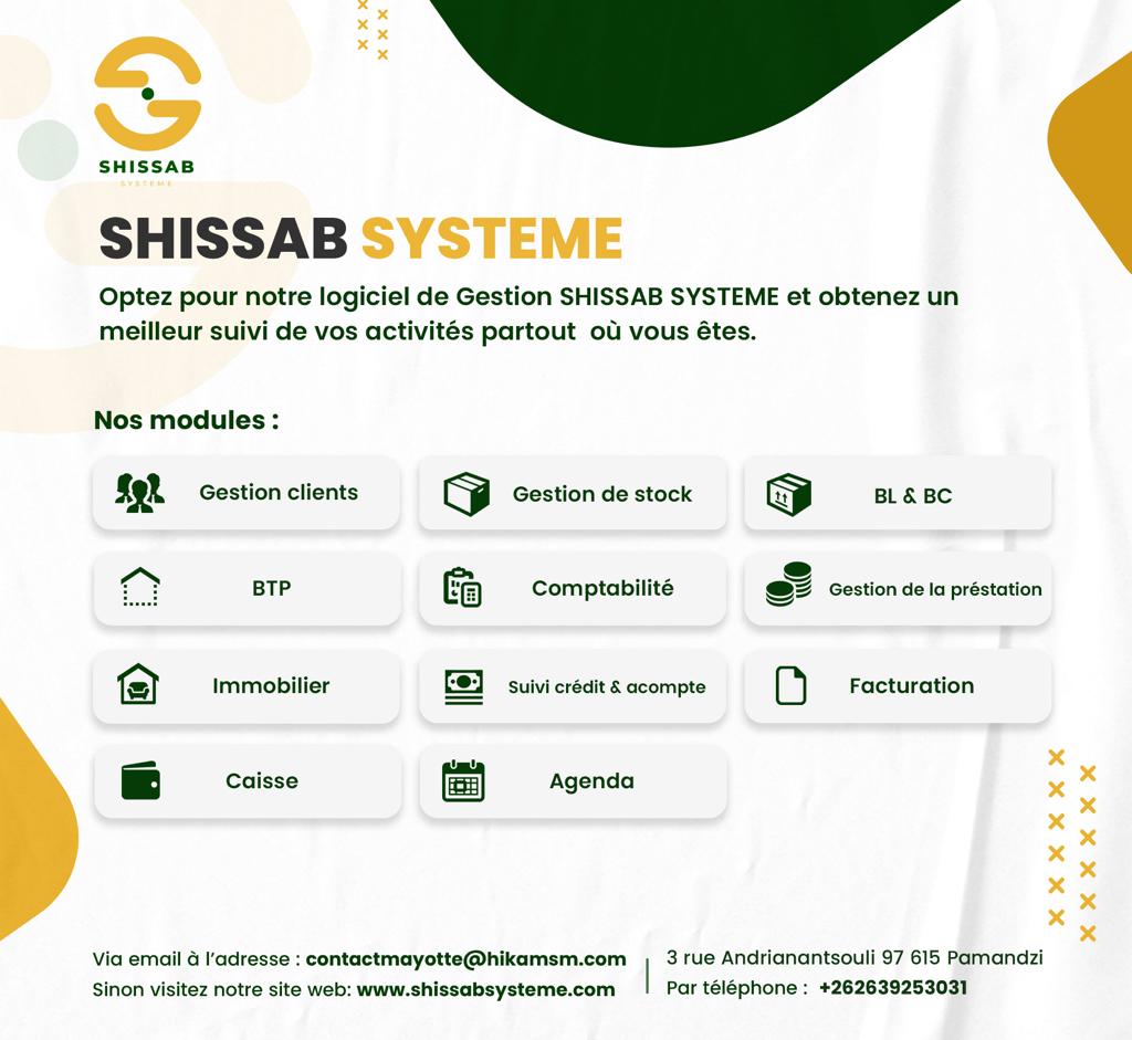 SHISSAB-SYSTEME est un logiciel connecté offrant plusieurs modules. Il est conçu pour être utilisé dans un cadre de sur-mesure et maîtrisé afin d’offrir une large visibilité au client pour mieux organiser la gestion des activités de son entreprise. L’expérience des clients est exploitée pour en faire un challenge et améliorer le service pour un meilleur rendement. Et les suggestions des clients sont prises en compte pour leur faire vivre le meilleur des expériences.